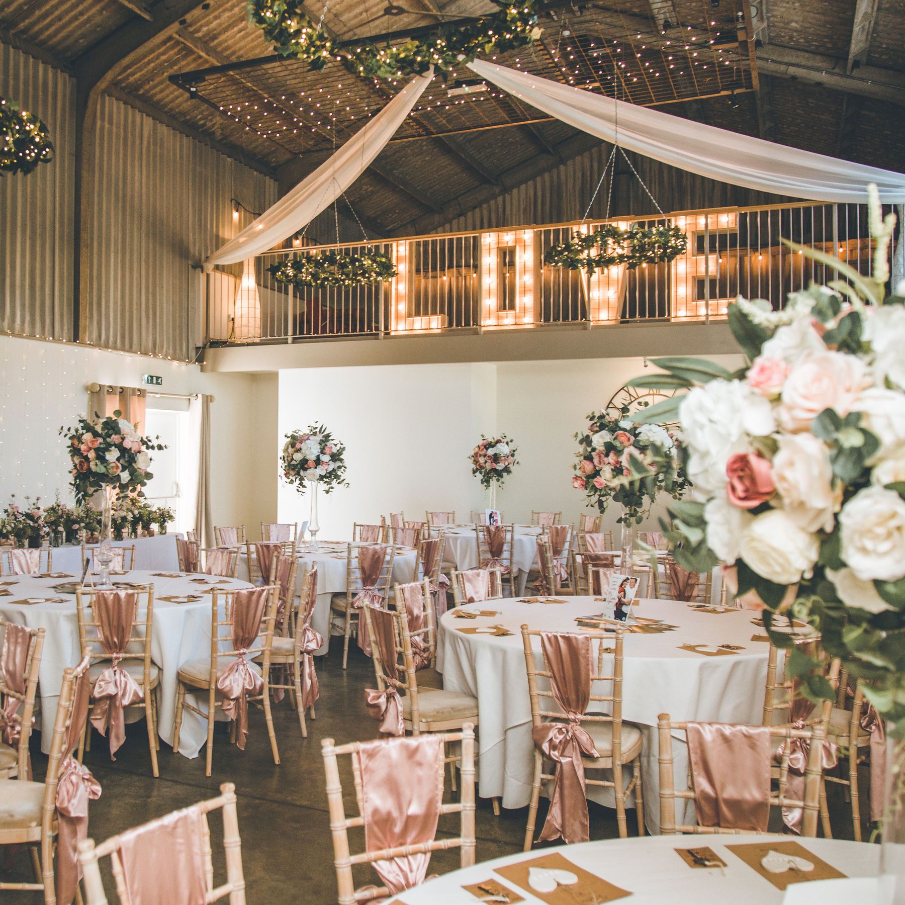 Exclusive use of the gardens and grounds providing a myriad of photo opportunities The use of the dressing room before your wedding – access from 10.30am on the morning of your wedding A contemporary wedding barn with a galleried dining room seating up to 150 guests A dance barn with sprung oak dance floor adjoining the dining barn A beautiful wedding marquee and gazebo for outdoor civil ceremonies (April-October) A team of wedding coordinators to guide you through the whole wedding planning process Your own dedicated Wedding Manager on the day to make your wedding run smoothly A southwest facing terrace over-looking the wedding garden for you drinks reception, furnished with tables, chairs and parasols The converted Foundry for indoor ceremonies A shaded Woodland area for unlicensed celebrant weddings As many round tables as needed for your wedding breakfast Lime-washed Chiavari chairs for your ceremony and wedding breakfast Fully stocked and staffed bar Fairy lights illuminating the main bar ledges Illuminated ‘BAR’ sign Fairy wall lights for the whole of the back wall inside the venue An evening food terrace Festoon lights around the wedding garden Use of Moposa, our online wedding planning tool which includes: Personal wedding website Guest management system for creating a guest list, etc. Free online invites & RSVP tool Table seating plan tool A budget planner A to-do list organiser An image gallery that you can personalise to create your own lookbook