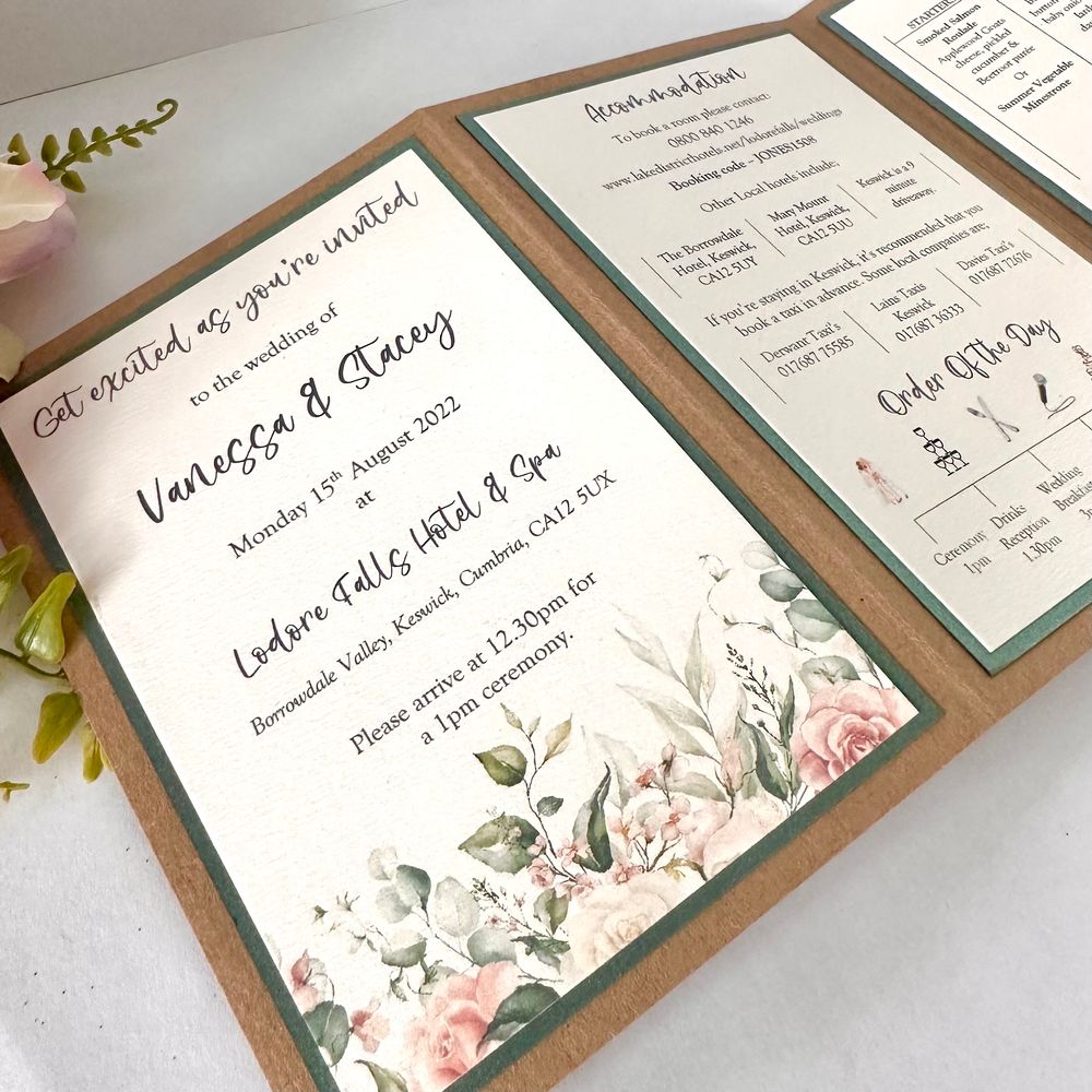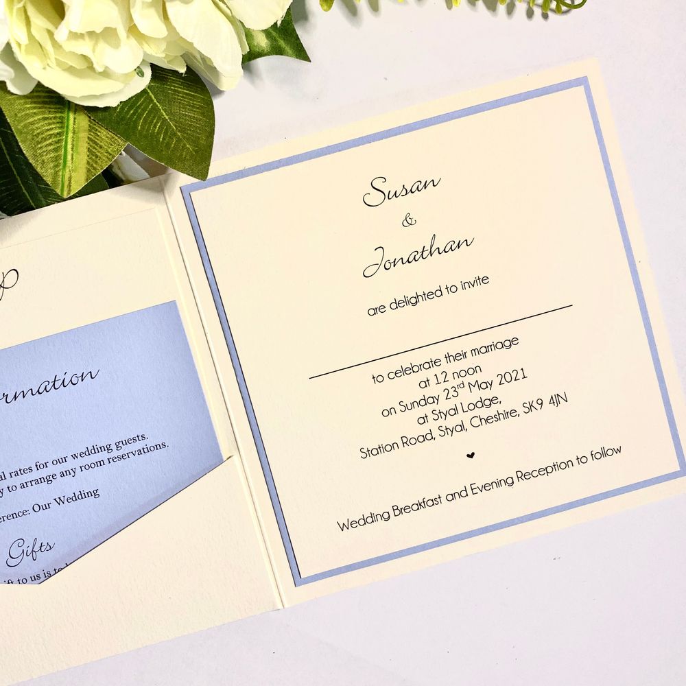 We are an award-winning Wedding Stationery design studio based in Cheadle Hulme, Stockport and offer a nationwide service. Choose your favourite design from our range of Save the Dates, Wedding Invitations and Day Stationery, and we will send you a FREE personalised sample in the post. Established in 2009, we are a professional wedding stationery business based in Stockport, South Manchester. We offer Save the Dates, Wedding Invitations, Order of Service, Table Plans, Table Names, Place Cards, Menus, Thank You Cards and Wedding Signage. Our free sample service is extremely popular as it allows couples to check the quality of our work before placing an order. Everything on our website is easy to personalise in terms of colours, fonts and wording, and we are also happy to take on bespoke projects. If you are local to us, then you are also welcome to book in for a private consultation. In terms of pricing, we offer designs to suit most budgets. Simple flat save the dates, and flat invitations start from £1.50 each, going to Pocketfold Wedding Invitations around £6.00. These prices all include envelopes and standard printing. Foiling, White Ink, Letterpress and other specialist print techniques are available on request.