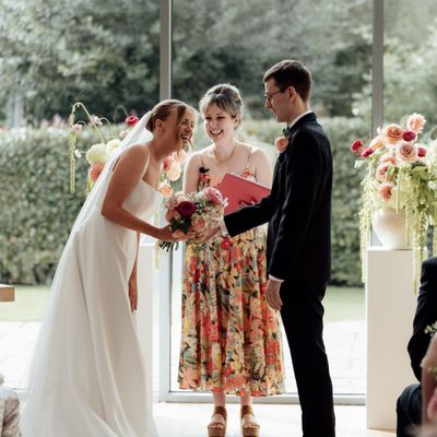 Sarah was amazing. We only spoke to a couple of celebrants as when we came across Sarah, her personable and professional manner won us over. We did plan our wedding all a bit last minute, but Sarah was great at breaking down when and what she needed from us and it was a joy to speak to her. In fact, talking to her so she could get to know us better and write her script, was one of the most fun parts of organising the wedding, as it gave us a moment to think about us and our journey as well as laugh and remind us why we were doing it. Sarah has a wonderfully warm and sweet manner about her, which made us feel very comfortable sharing everything, the good and bad stories, equally. She was also very flexible to our schedule, meeting us as and when needed, which was very considerate. We ended up choosing a couple of readings from her selection of examples as they were so unique and personal to us and she gave us her script early on and any changes we needed, she kindly indulged us. She suggested a lot of different ways for us to do the ceremony and graciously didn't insist when she picked up we were not so keen on some. Then, we met to go through a rehearsal, and it was like meeting an old friend. As we'd shared so much, Sarah became part of the people we wanted to tell our story to. I left the rehearsal feeling at ease that Sarah had understood what we wanted on the day and was going to be there ahead of time making sure it was all set up, with the help of a couple of friends. But I had more confidence in her than my friends, who were a bit nervous and she kindly offered them help and reassurance with their tasks. A dream. On the day itself, it all went swimmingly, her delivery and set up of the atmosphere were perfect, neither of us were nervous before the ceremony as we were confident it was in the right hands. Her diction, pace and execution of it all was touching, humourous and in tune with who we are. I remember her wonderful smile and warmth and discretion, and we could not have asked for better. I would highly recommend Sarah, she is sensitive to needs and requests and very adaptable whilst adding her kind, fun and gentle nature to the celebrations. Thank you again for helping us in creating a magical day that we'll remember for the rest of our lives.