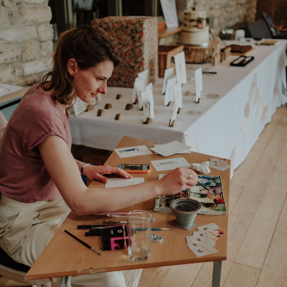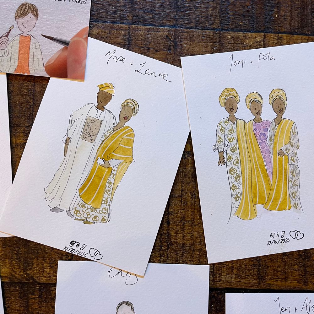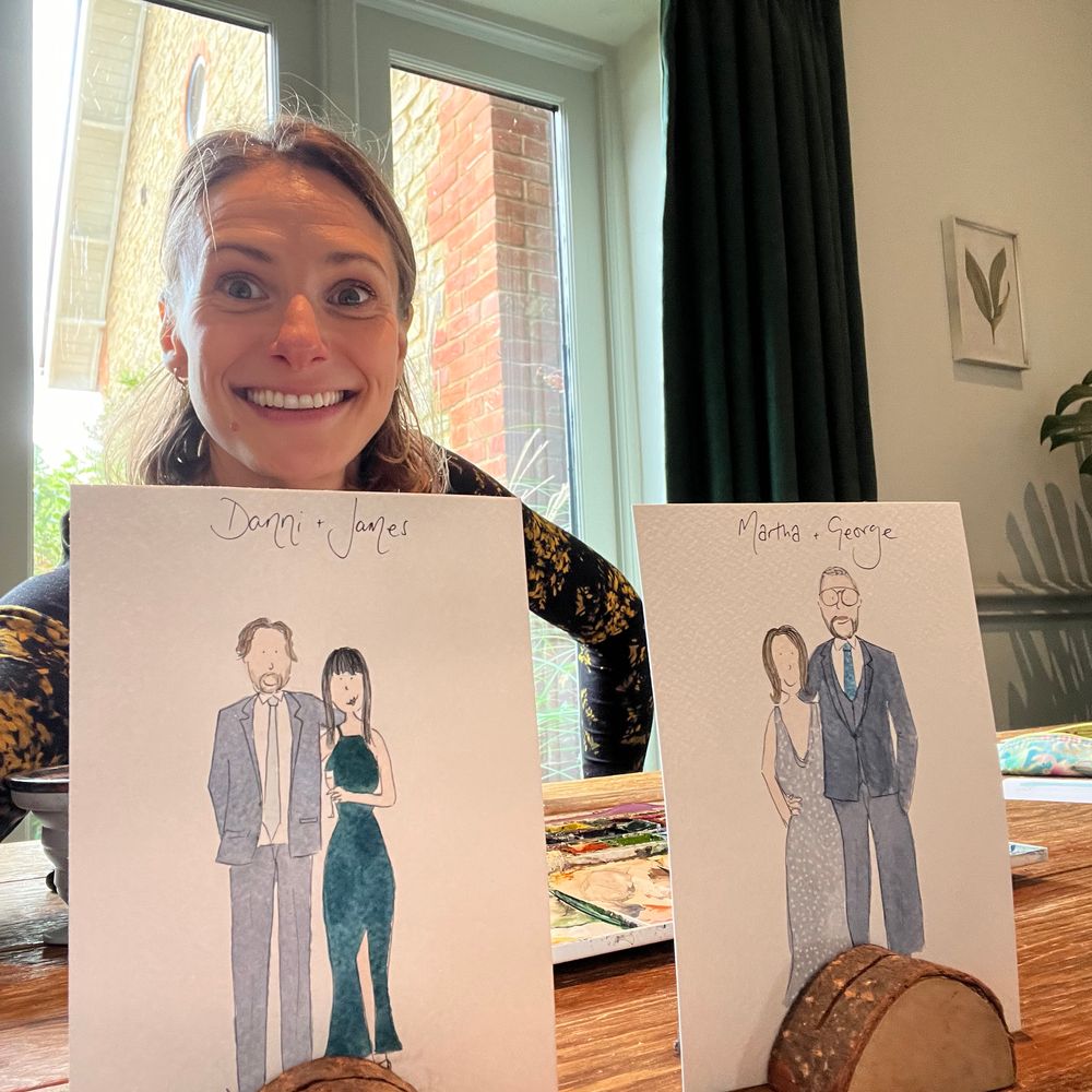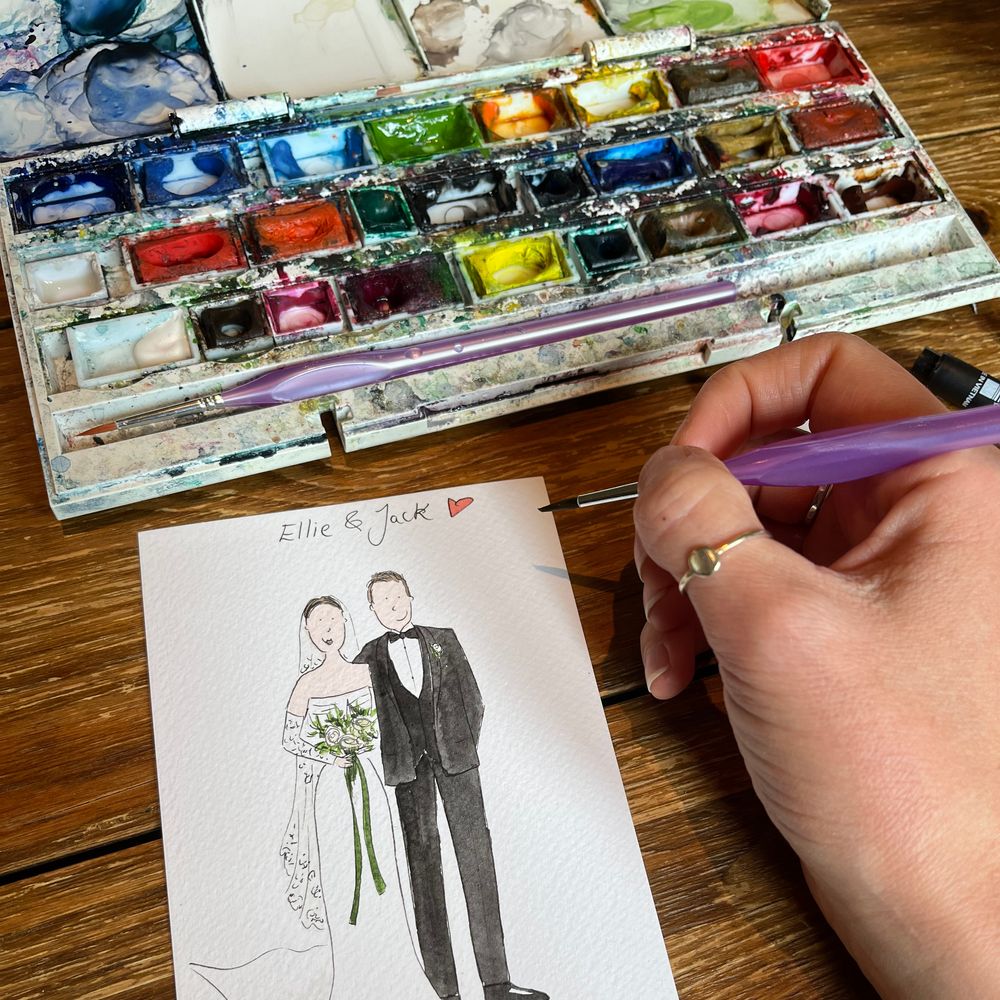 Hi, I am a live portrait illustrator. Painting watercolour portraits of all your guests for the most unique wedding favour ever! Think of me like a live, hand-painted Photo Booth! I arrive before the ceremony and take photos of all the guests, so nobody wastes any time posing for a painting. During the ceremony and then throughout the day, I will hand-paint everyone on lovely, textured watercolour card. Guests can come and watch me work, providing entertainment, and then take home and frame their very own personalised watercolour portrait- a gorgeous memory of your day! Alternatively, the married couple can take all the paintings home to have a good look through, take photos and then send them out as personalised thank you cards. Entertainment, wedding favours and thank you cards, all in one! And in this era of digitalisation, my hand-painted designs offer that touch of love and personalisation to your day.