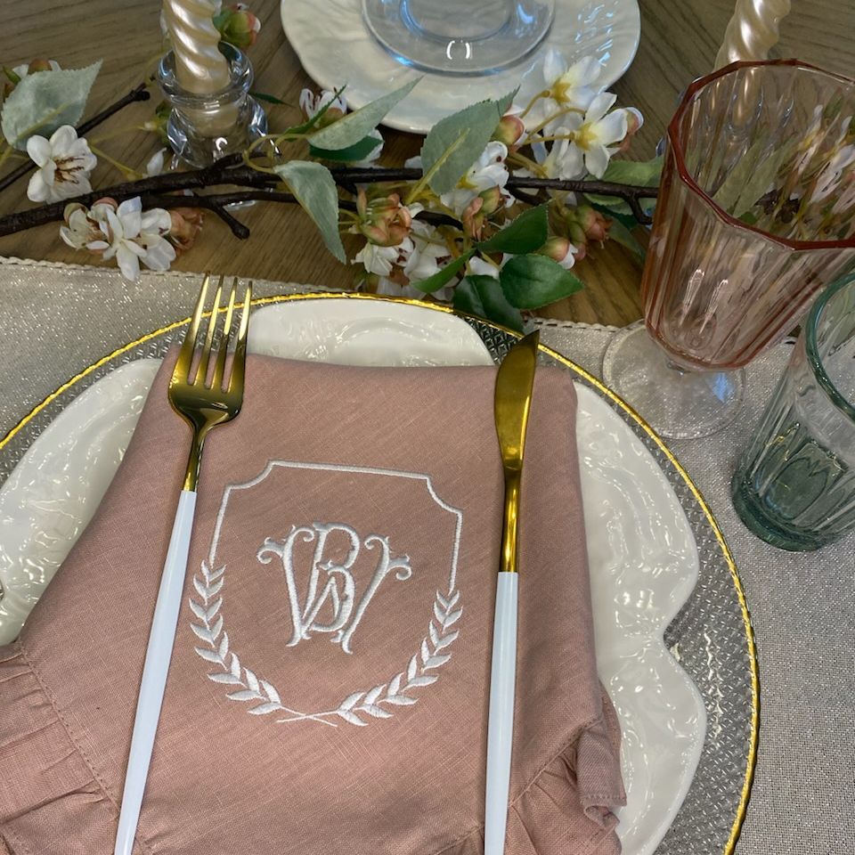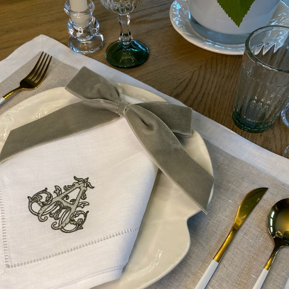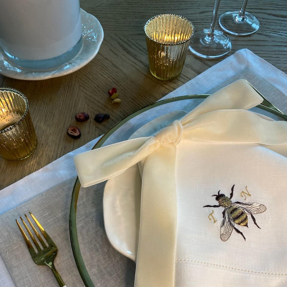 We offer bespoke tablescape products, including napkins and ribbons that are personalised with embroidery, names, dates or monogramming to create a truly unique tablescape and fine dining experience.