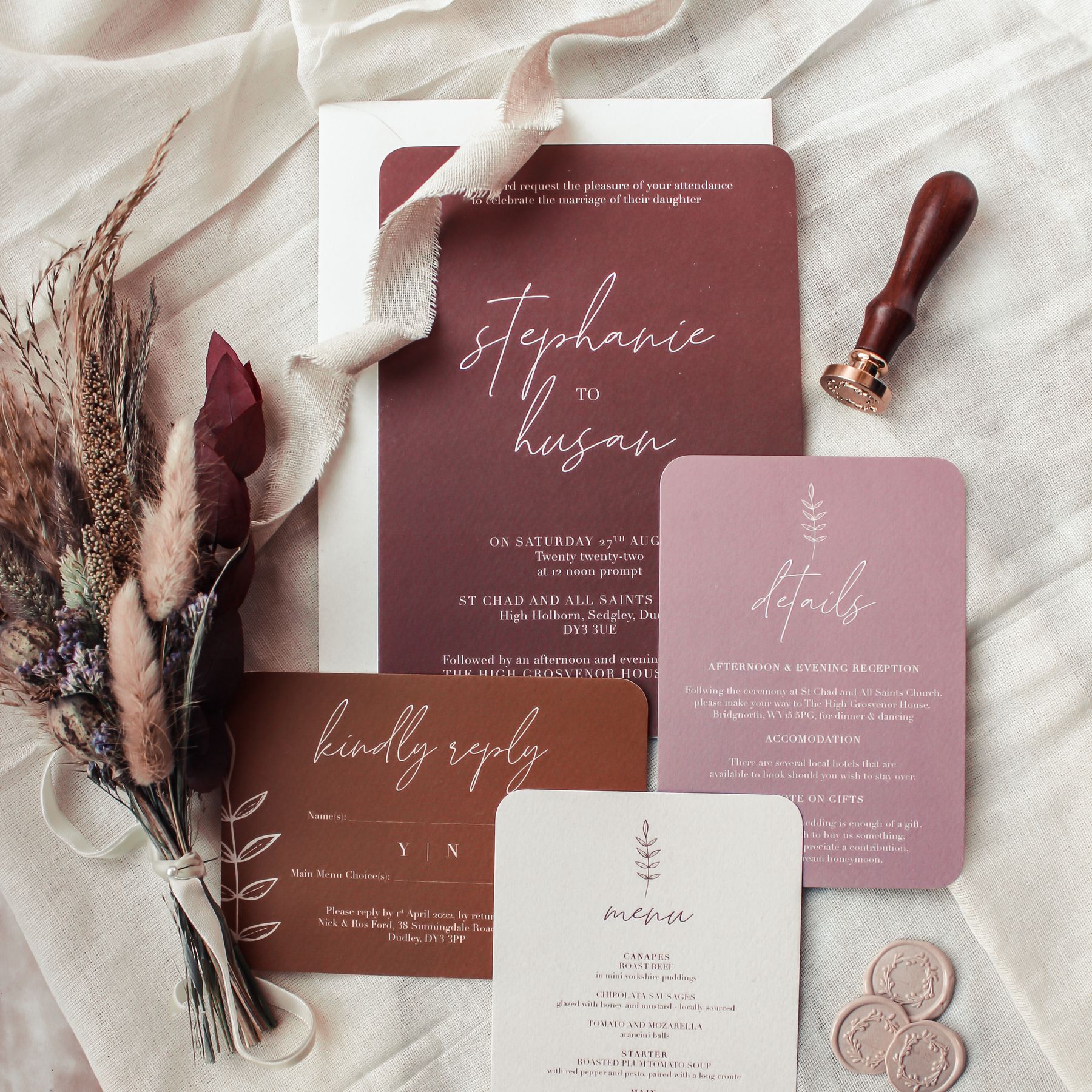 Anything & Everything. Even if its something I haven't done before I will give it a go! My most popular stationery items are: - Save the Dates - Invitations - RSVPs - Info Cards - Table Plans - Welcome Signs - Order of the Day - Table Numbers/Names - Place Names - Menus - Thank you Cards