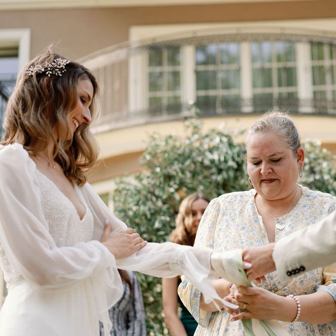 Miranda acted as celebrant for our wedding this summer at Chateau de Saint Martory, France. Throughout the whole planning process, Miranda was very enthusiastic and generous with her time. Ahead of the wedding, she travelled to London to meet with us in person, we had video calls, she joined us for the rehearsal in France, and we had lots of back and forth over email… Miranda’s attention to detail, helpfulness and thoughtfulness in the lead up to the event, on the day itself, and even afterwards can’t be faulted. She wrote the order of service for us, helped us choose the readings, wrote a personalised ceremony script, designed a bespoke marriage certificate, posted a lovely video/summary of the day on socials, and even sent us a Christmas present! She has tons of experience in weddings of all varieties, which was evident from some of the unique ideas and hints/tips she gave us, as well as her flexible, accommodating attitude. Miranda exudes warmth, confidence and energy, and brought all of this to our ceremony. Although we aren’t particularly religious, we wanted to keep the “sermon” fairly traditional, and Miranda achieved this with the eloquent script she wrote for us. However, she also managed to weave in some personal anecdotes and give it a heartfelt feel that resonated with friends/family. There were certainly a few tears shed that day! Miranda also helped enormously with the logistics, liaising with our wedding planner, florist, bridal party and string trio to ensure the ceremony went smoothly. Whilst very nervous, on the day we knew that everything was well and truly in hand! Our wedding day was very special, and we are delighted with how it went; the beautiful ceremony was a huge part of that. We couldn’t have done it without Miranda, and would thoroughly recommend her services to anyone planning a wedding!