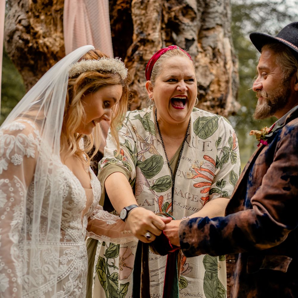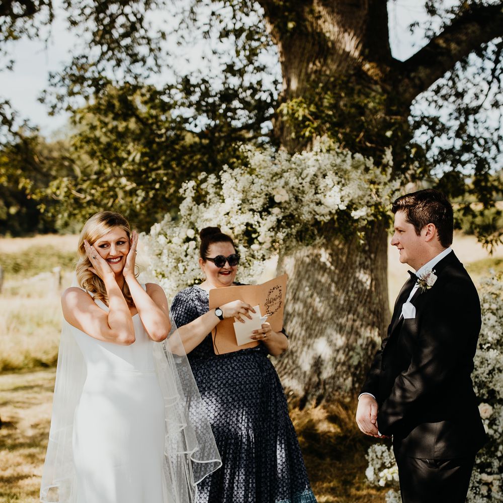 Wow. Where do we even start? From the moment we met Miranda we were struck by her incredibly warm and bright energy. A celebrant makes your wedding so much more personal, and Miranda is an absolute expert. At every step, we felt so reassured that we had made the perfect choice. Miranda, thank you from the bottom of our hearts for everything you did to make our day so amazing. It takes a truly special person to organise our two unique styles into something so cohesive and beautiful. Not only that, but despite having a far from traditional ceremony, all of our guests felt comfortable and entertained. Thank you for sorting through the pages of answers to your questionnaire and working with us to make the ceremony flow so seamlessly (and carrying on so professionally even when that arch fell over!) your good humour and excellent way of addressing crowds made everyone so much more at ease. The way you accommodated us when we needed to change certain aspects was wonderful. Your advice on the vows was so useful, and definitely came out in those unexpected happy tears on the day! So many people have commented on what a unique, magical ceremony we had, and who can blame them. You are an absolute delight and well deserving of your National Celebrant of the Year award! We will be forever grateful to your help and kindness that made our wedding dreams come true.