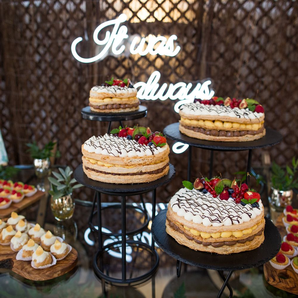 This is a traditional Northern Italian wedding cake, consisting of layers of handmade flaky puff pastry, creme patisserie (In a choice of flavours) and chantilly cream. It is topped with lots of berries. These cakes are usually assembled at the venue in front of your guests adding a touch of theatre to your wedding cake experience. You can even choose to make this interactive by finishing off your cake with a dusting of icing sugar for a perfect photo opportunity.