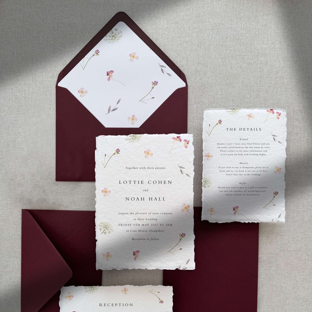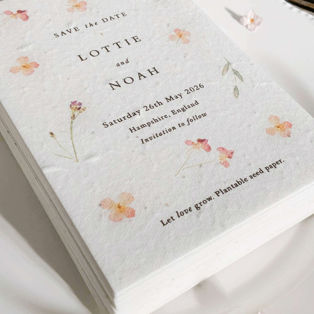 All of our invitations are recyclable and biodegradable. We use vegetable-based inks and FSC certified card stock. Additionally, we offer a range of plantable save the date cards. Each card is embedded with daisy, poppy and forget-me-not seeds and sustainably crafted in one of the UK’s oldest paper mills.
