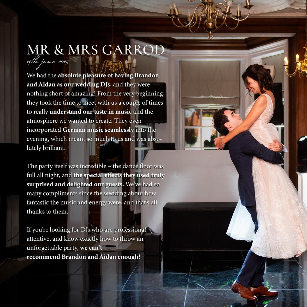 Sancara are a UK-wide wedding DJ duo bringing epic vibes to your big day! Brandon (Ibiza & Magaluf DJ) and Aidan craft every set just for you — with a custom first dance light show, free travel, flip-flops, and kids’ ear defenders. Fun, friendly, and guaranteed to keep you dancing all night! Looking for wedding DJs who’ll keep your dancefloor packed all night? 🎉 Meet Sancara — the UK-wide duo bringing energy, fun, and unforgettable vibes to your big day! Every celebration is fully tailored to you, with a custom first-dance light show, free nationwide travel, flip-flops for tired feet, and ear defenders for little ones — all included. Behind the decks are Brandon, an Ibiza & Magaluf resident DJ who’s performed alongside Olly Murs, Yungen, Charlie Sloth, and Big Narstie, and Aidan, a master of wedding entertainment with years of experience as a mobile DJ, event host, and lighting designer. Known for his smooth announcements and seamless light control, Aidan keeps every moment flowing perfectly — from the first dance to the final song. From bespoke playlists and stunning venue uplighting to hilarious party games and flawless coordination with your venue, Sancara go above and beyond to make your night truly unforgettable. Friendly, experienced, and full of good vibes 🥳😄
