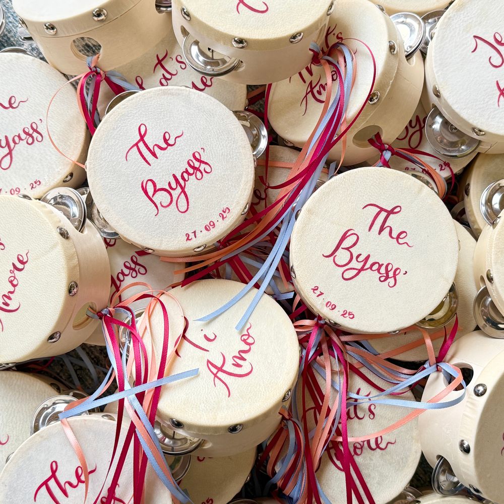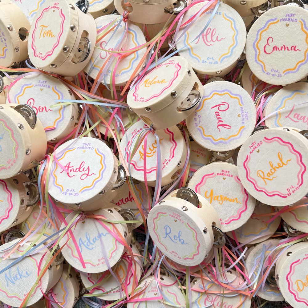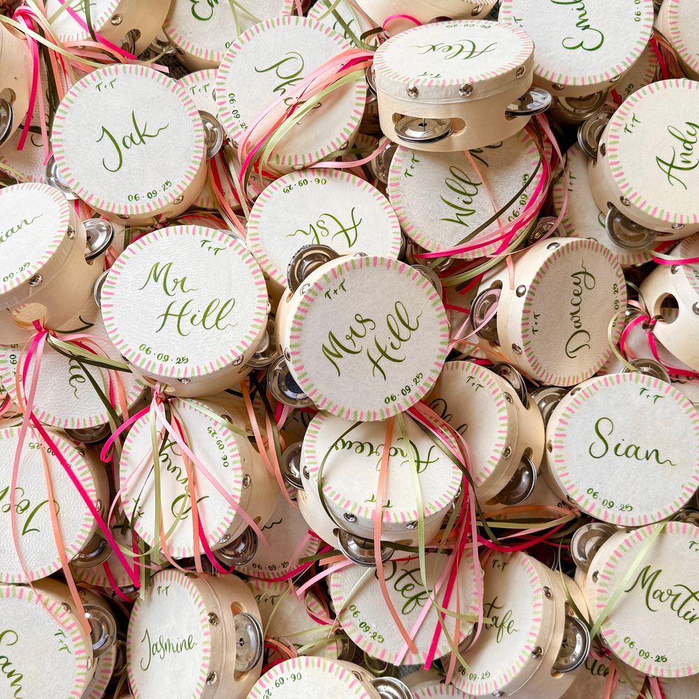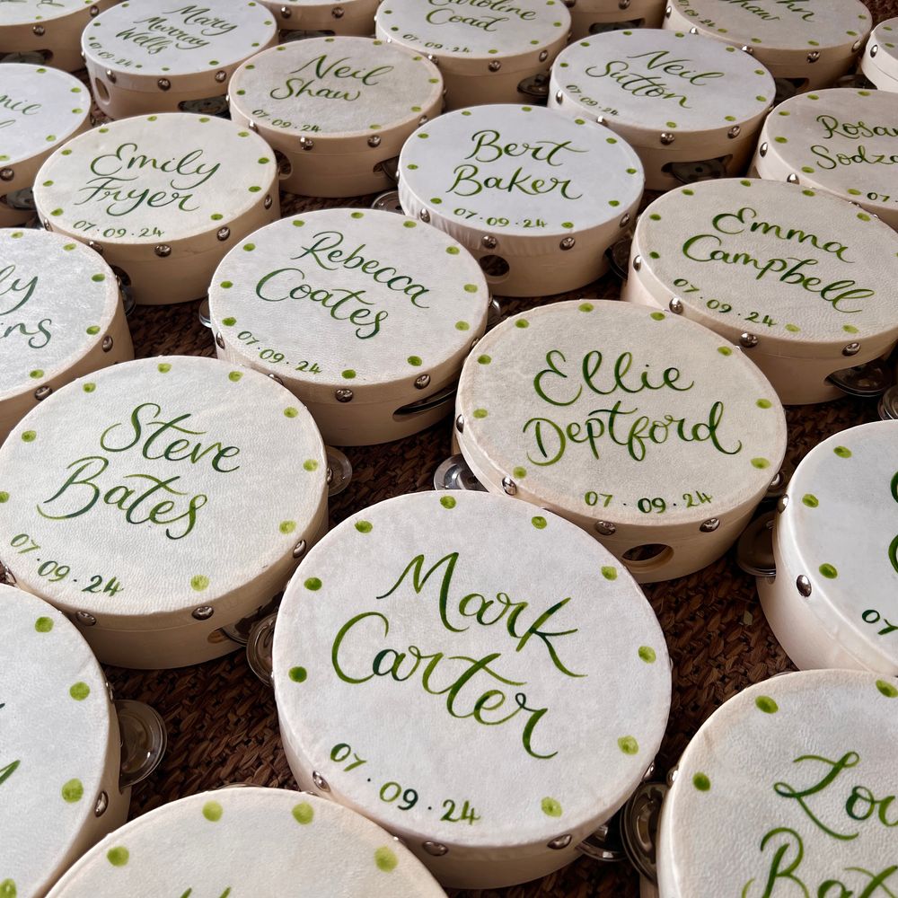 A fabulous touch to our special day. Cathy-Ann was incredible throughout and even hand-delivered all our wedding stationery. Our guests loved the fun of the tambourines and they still sit proudly over our fireplace at home. Everything was totally bespoke and nothing was too small or big to tweak to make it 'perfect'. We are beyond delighted with how it all turned out. High quality, eye-catching and everything we could have wished for. I cannot recommend Studio Joy/Cathy-Ann more highly. It was a joy from start to finish and I can't wait to use her again and again. I am so happy, thank you from the bottom of our hearts!