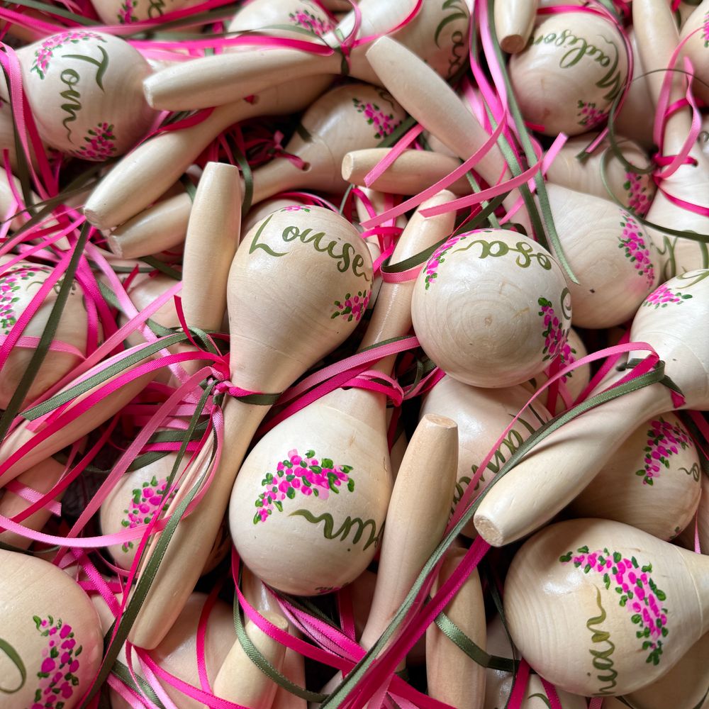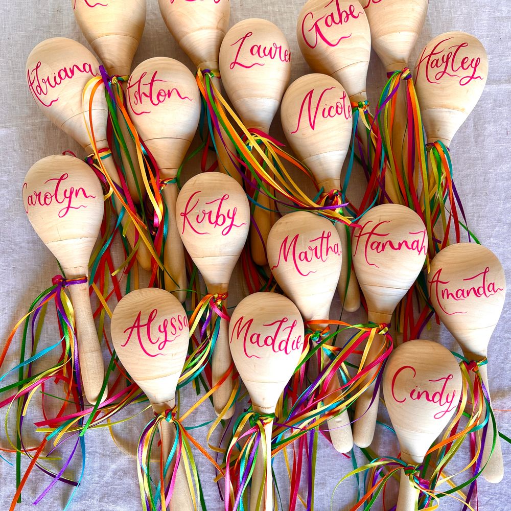 Our pricing is split into three design tiers, going up in price as the design becomes more detailed. Tier 1 is lettering only, no illustration. Tier 2 is lettering but also a small amount of illustration. For tambourines this is a simple border (wavy, straight, scalloped, dotted, striped). For maracas and castanets this would be a small icon illustration such as a butterfly, a rose bud, an olive branch. This tier is to add a little something without it taking too long to turnaround. Tier 3 is full illustration and lettering, this is the tier for anyone wanting the ultimate wow factor.