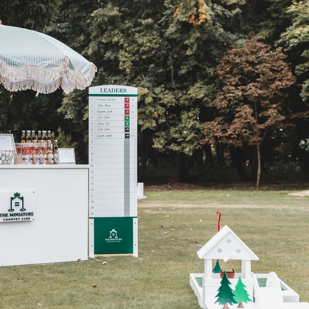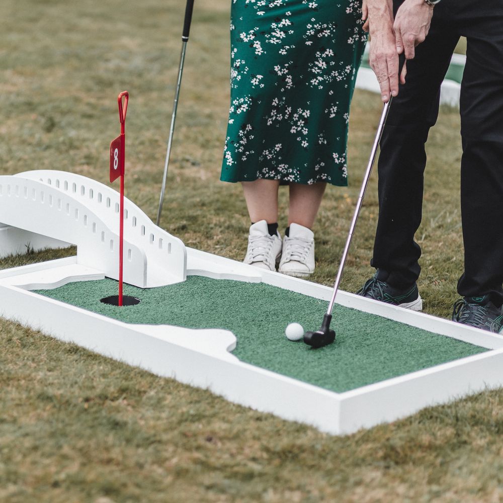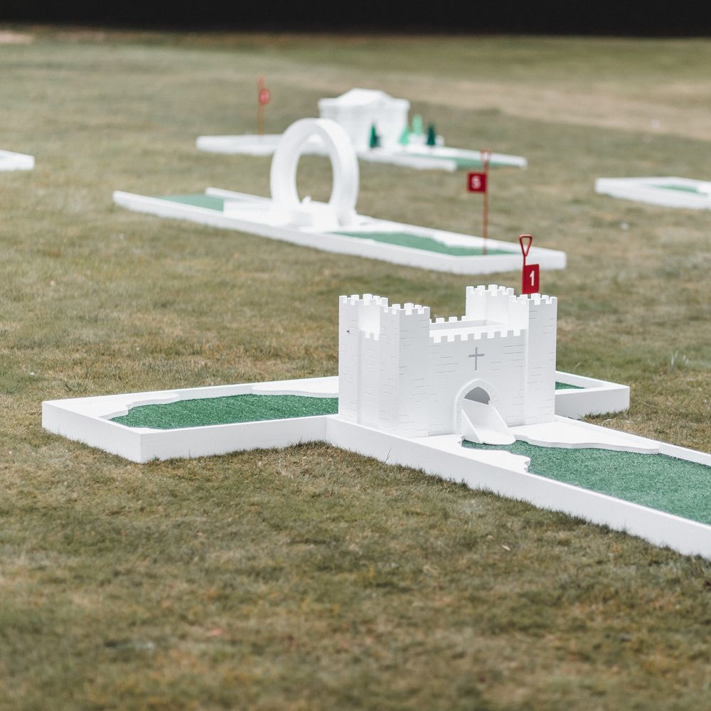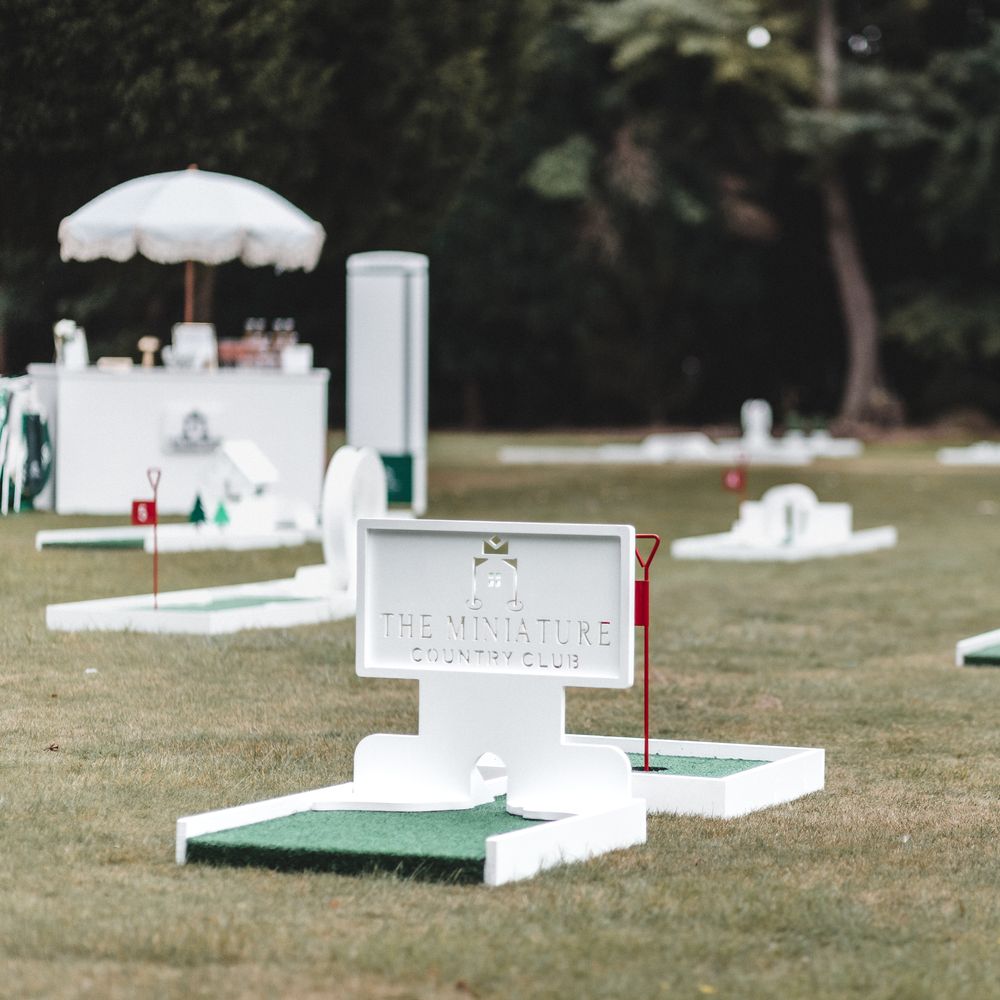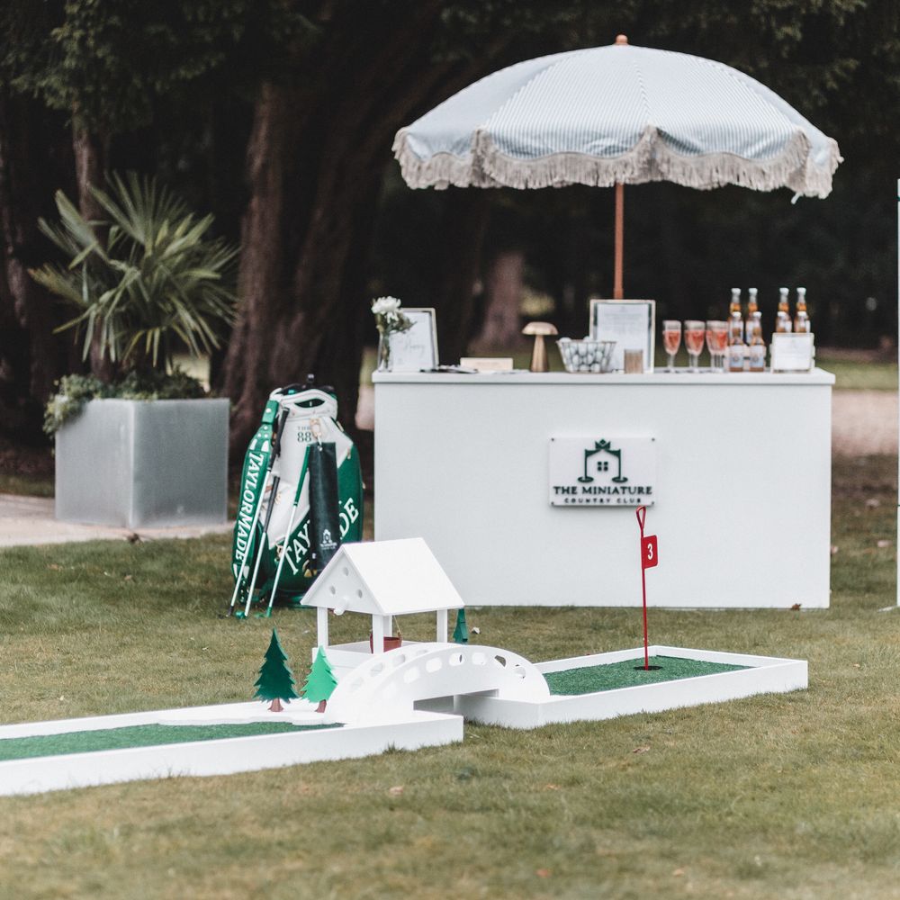 Elevate your drinks reception with our sophisticated Miniature Golf Course and Garden Games for the stylish bride, groom and avid golfer. Your guests will be enamoured with our interactive course and tournament; bringing them together to enjoy some competitive fun. Welcome to The Miniature Country Club, a stylish and elegant mini golf course; bringing unforgettable moments and class to your wedding day. Every element has been thought through so that you get the best experience. We have designed every single one of our signature holes with the avid golfer in mind, bringing together functionality and sophistication. We have also integrated Croquet and Garden Games into The Country Club. The Croquet set is premium quality and really brings that next level of luxury to your day. Pair that alongside 5 ft tumble tower, boules, Cornhole and Connect Four and your guests will be entertained for hours. We will welcome your guests at the Country Club Check In, hosted by our staff, and serve your reception drinks from our Bar if requested. Worried about the weather? Our course can also go inside! With multiple packages on offer and the opportunity to go bespoke for the ultimate soirée, we simply cannot wait to hear from you x