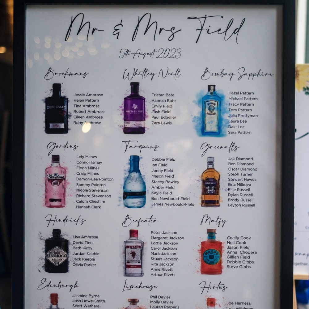 Beautiful wedding stationary. Tops Designs helped us with our gin themed wedding by creating us a table plan and order of the day. Our table plan was an A1 print with watercolour gin bottles. The quality was exceptional and we even went as far as asking Tops Designs to frame it for us, so that we could display it in our home. Would definitely recommend!