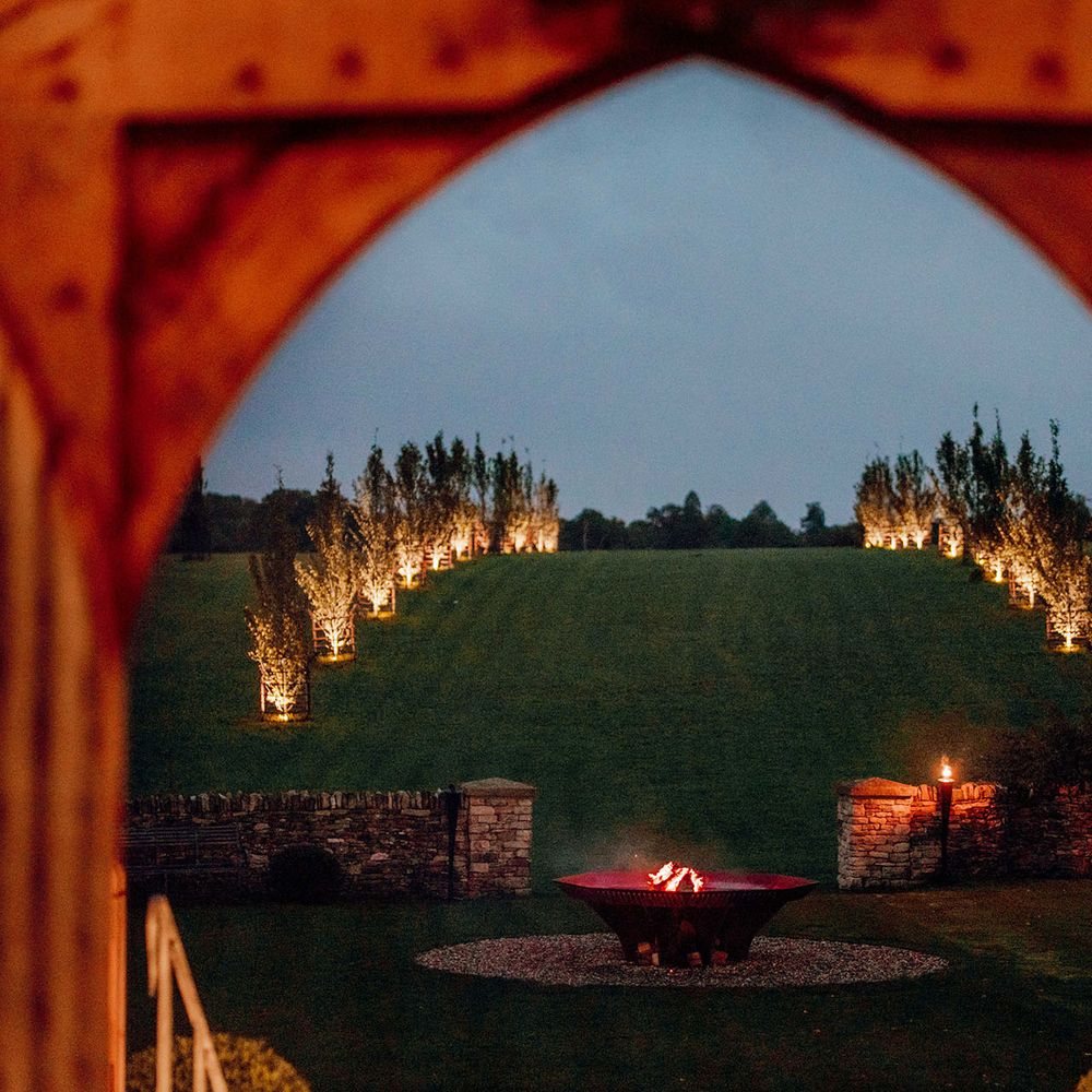 An 18th century Cotswold barn set in stunning countryside near Bibury. With its flagstone floors, rustic beams and open fireplace, this historic building provides a wedding barn for all seasons. Cripps Barn is an 18th‑century stone barn in the Gloucestershire countryside near Bibury. Surrounded by fields and woodland, it’s rustic yet stylish, with soaring beams, a flagstone floor and a roaring fire. Whether intimate or lively, it’s designed to make your wedding relaxed, atmospheric and unforgettable. Ceremonies take place inside by candlelight and foliage or outdoors under the oak pavilion. The barn hosts up to 150 for the ceremony and meal, and 200 in the evening. Guests can enjoy drinks on the terrace before feasting and dancing late into the night. Food is cooked over open flames, barbecue, rotisserie and asado, serving whole roast lamb, sirloin of beef and chargrilled seasonal vegetables, paired with cocktails or hand‑picked wines. Our experienced team guides you through planning, with chefs, bar staff and coordinators ensuring everything runs seamlessly so you can enjoy every unforgettable moment of the best day of your life.