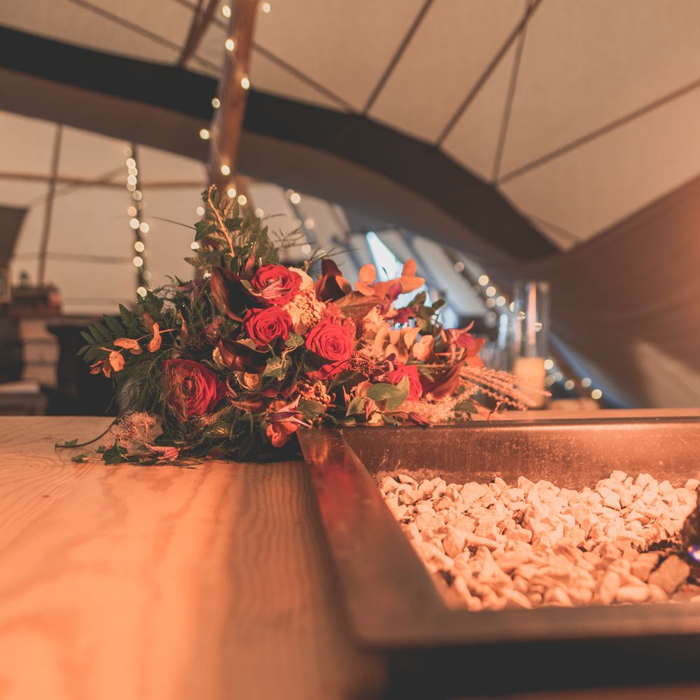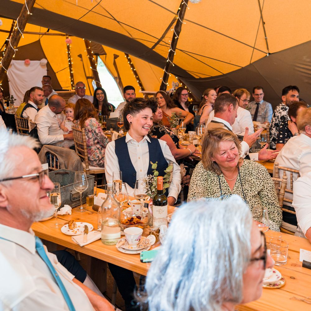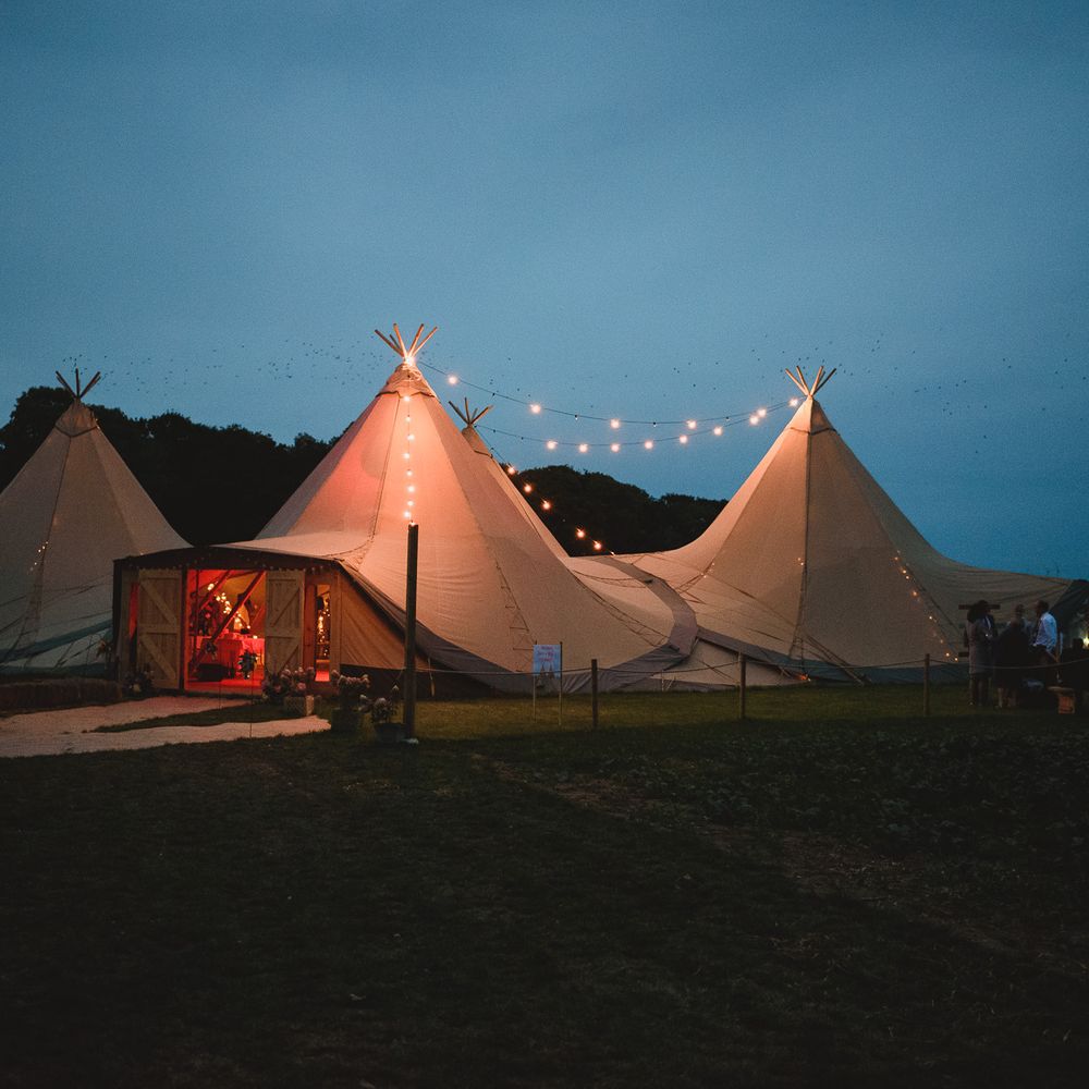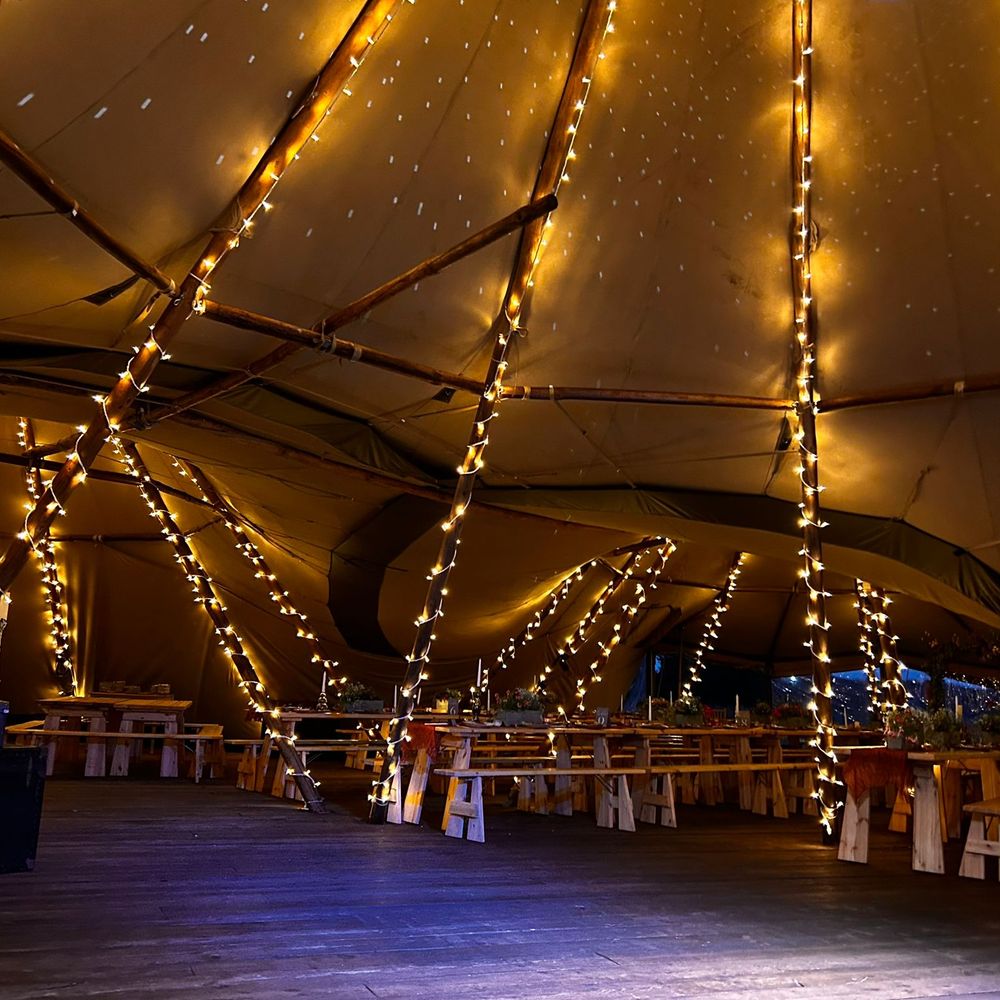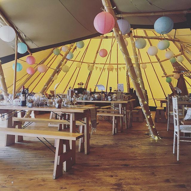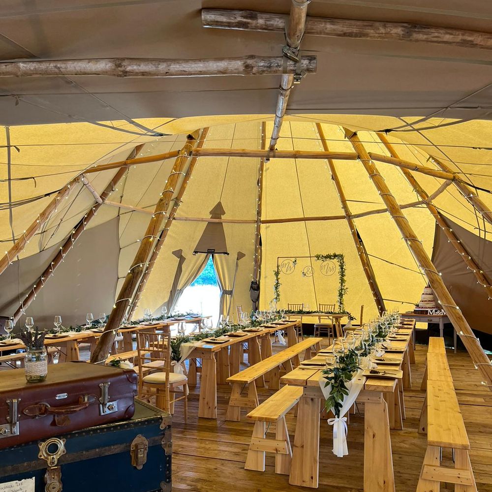 There is one cost for the venue hire which includes the following: • Four giant tipi hats • Wooden flooring throughout • Access for 4 hours day prior for set up. Access from 9am until 12.30am on day of your wedding. Access from 10am to 12noon day after the wedding to clear away. • 18 tables • 36 benches • 15 chairs • Fairy lights on most poles • Bar set up • Pay bar (packages can be arranged and we can take cash or card on the bar) • Luxury Toilets • Power (via silent running generator) • Parking • Selection of tables/trunks/suitcases for display purposes • Indoor and outside firepit • Selection of outside seating and tables The tipis hold a maximum of 110 guests seated, 150 overall.