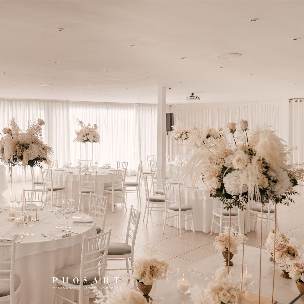 As part of paying the venue hire you will receive the following: 1. Professional DJ throughout the event 2. White gazebo with white curtains 3. White Chiavari chairs with silver-grey lining 4. Crochet beige umbrellas 5. Round & rectangular banquet tables 6. White tablecloths & white napkins 7. Clear glasses & silver cutlery