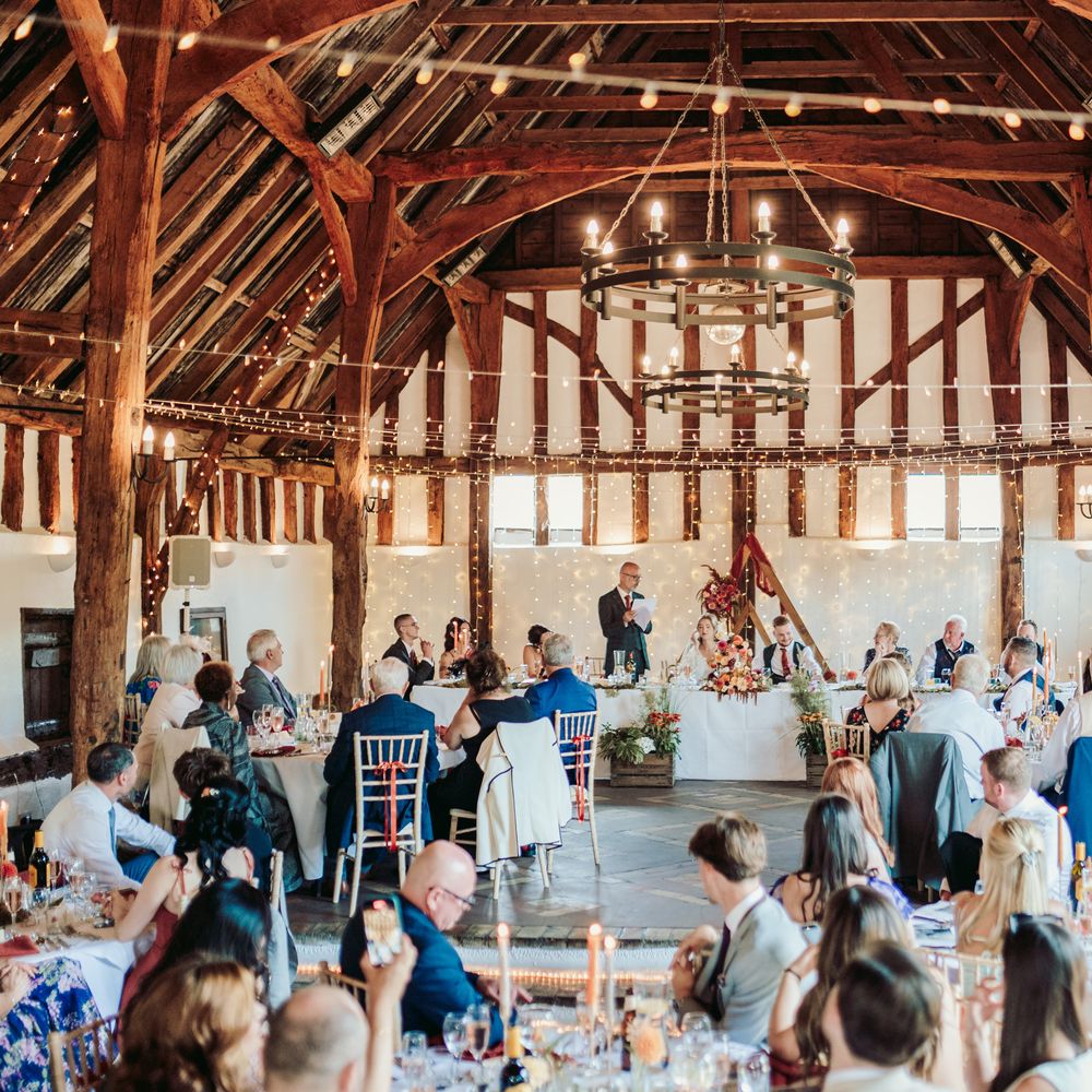 We are a family-run wedding venue (a beautiful, 16th century barn) with 25 years' experience. We want you, as a couple, to feel as much at home here as we do! With over 400 5* reviews, we have every confidence you will want to get married at Smeetham Hall Barn. Smeetham Hall Barn is a family run, privately owned, 16th century wedding venue just outside Sudbury, on the Suffolk/Essex boarder. You have access to the barn the day before your wedding to set up with as many or as few people as you wish. Our packages are incredibly simple and include everything you need at your wedding from your venue - including your food for a certain number of day guests (80 at a weekend and 60 mid-week.) Our package caterer, Splinters, have been with us for 20 years - this is why it works so well! We are a no corkage venue, this means you can bring your own drinks into the venue for the drinks reception and wedding breakfast with no charge for serving or opening. Our barn is the perfect setting for small intimate weddings to the larger ones. We can accommodate up to 150 guests for the wedding breakfast and up to 200 in the evening. The barn itself has high a vaulted ceiling, exposed timber beams, and vintage chandeliers. We look forward to meeting you!