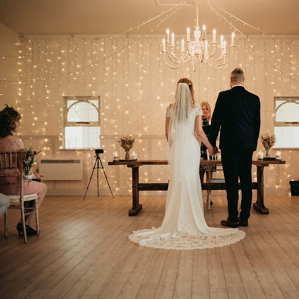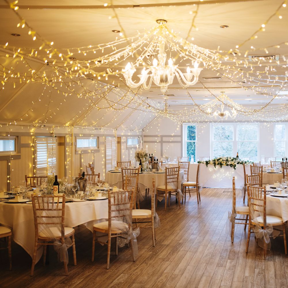 As previous hotel guests, Elaine and Rob had fallen in love with the postcard-perfect setting of our pavilion, bowling green and historical Normandy castle ruins - and wanted them to be the setting for their special day. The wedding décor was styled to reflect the Autumnal time of year, creating an intimate and enchanted setting with fairy lights, candles, lanterns and a Champagne reception.