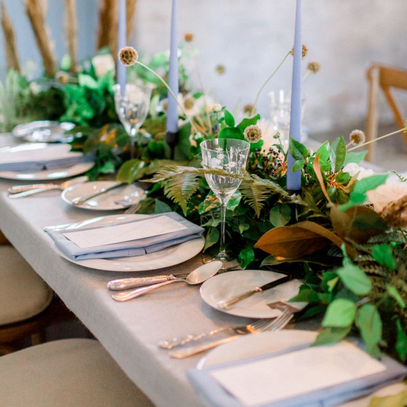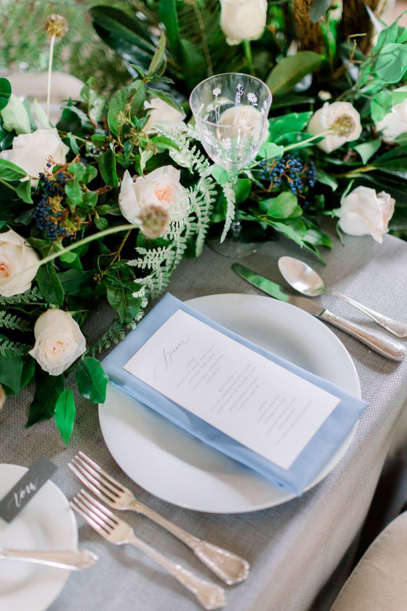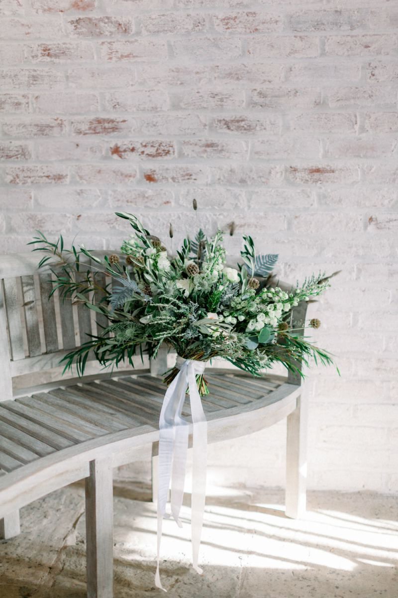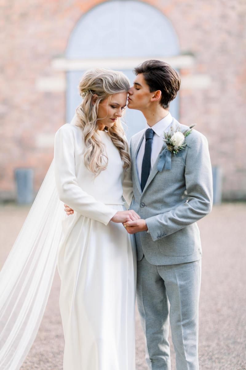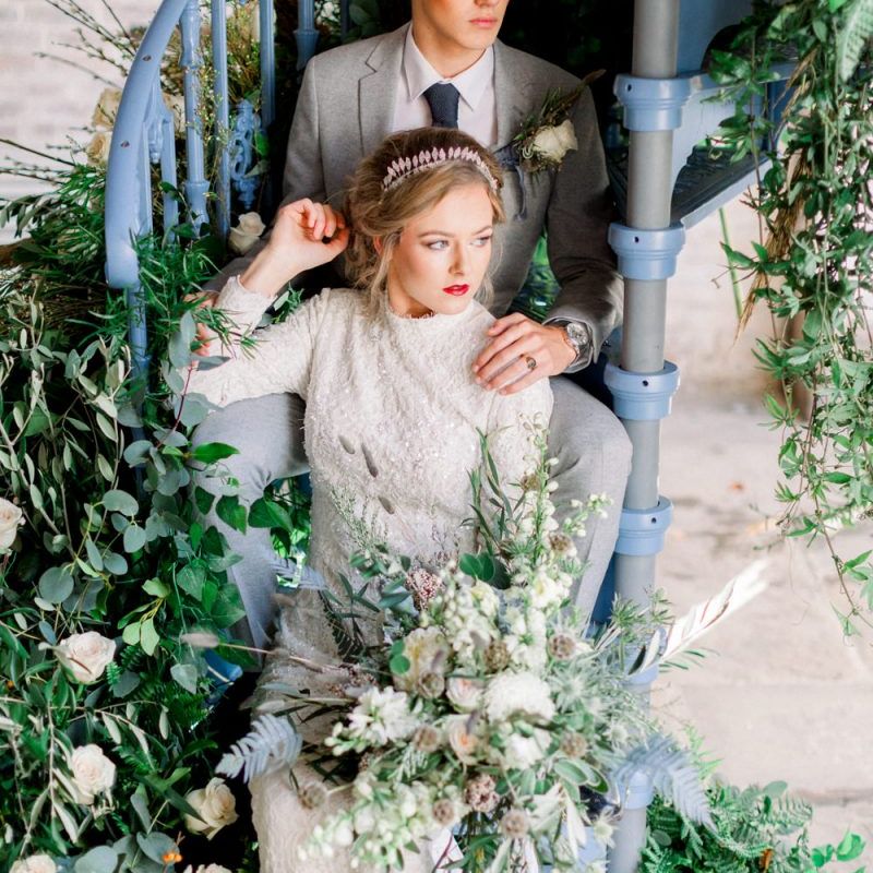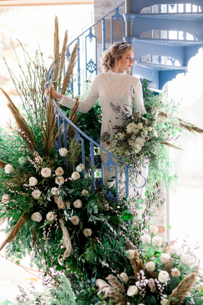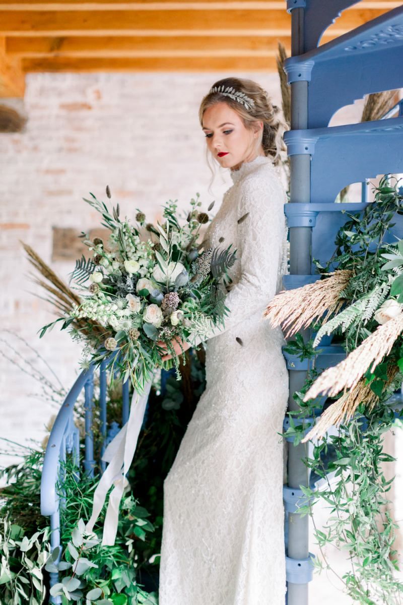 A group of talented wedding creatives headed for a beautiful styled shoot at the Cheshire wedding venue Dorfold Hall, a firm favourite among couples and suppliers alike. Capturing the magic and beauty that Winter has to offer was a major priority, and inspiration was taken from the beautiful shade of pale blue used on the Coach House doors and spiral staircase. This formed the basis for the cool colour palette, blues, greens, whites and pops of pale peach were used in the flowers, table set up and cake.