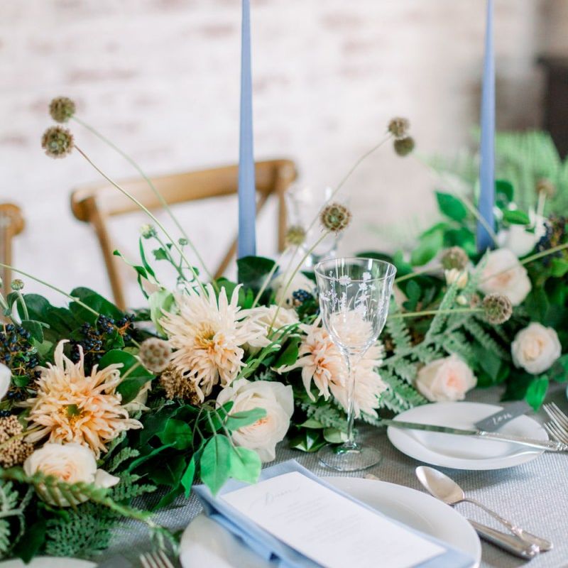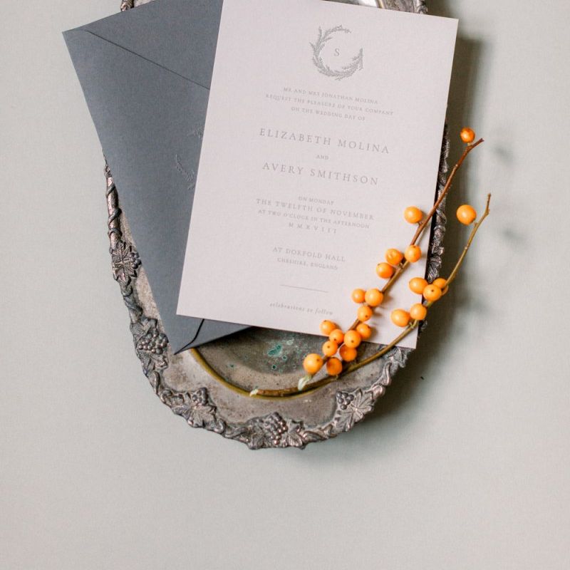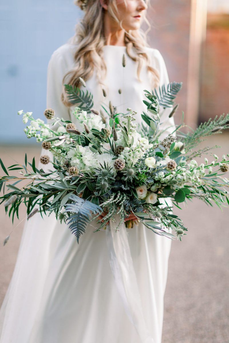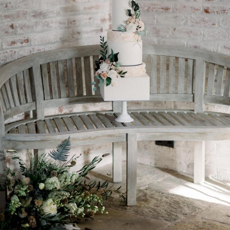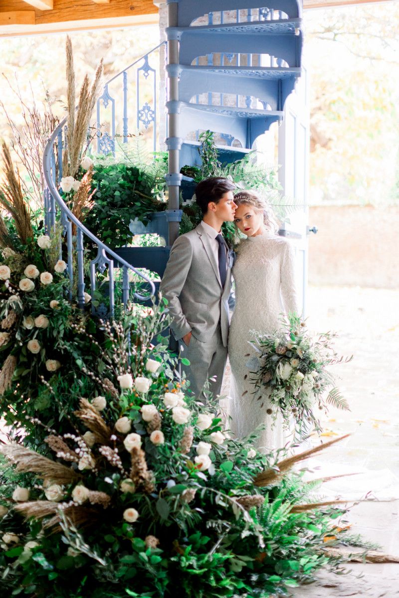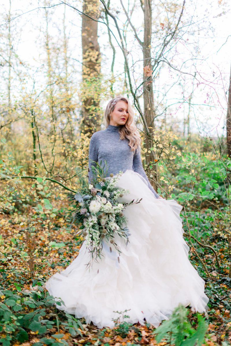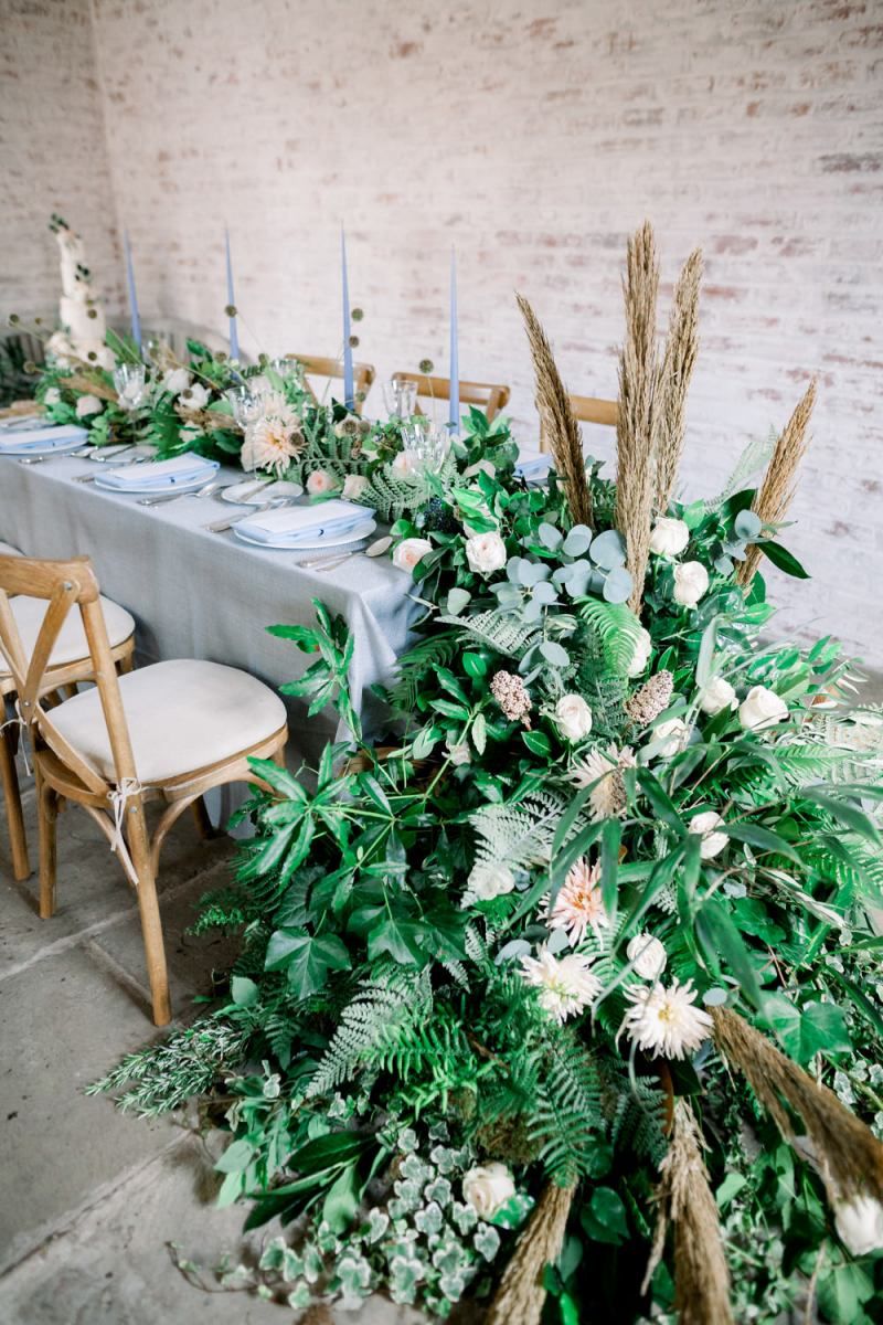 A group of talented wedding creatives headed for a beautiful styled shoot at the Cheshire wedding venue Dorfold Hall, a firm favourite among couples and suppliers alike. Capturing the magic and beauty that Winter has to offer was a major priority, and inspiration was taken from the beautiful shade of pale blue used on the Coach House doors and spiral staircase. This formed the basis for the cool colour palette, blues, greens, whites and pops of pale peach were used in the flowers, table set up and cake.